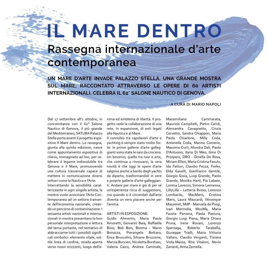Sono grata di partecipare alla mostra Internazionale ” IL MARE DENTRO” Ringrazio ai curatori Mario Napoli e Flavia Motolese della associazione SATURA per avermi selezionata. Inaugurazione Sabato 17/ 2022 dalle ore 17.00 In concomitanza con il 62° Salone nautico di Genova. SATURA Palazzo Stella.